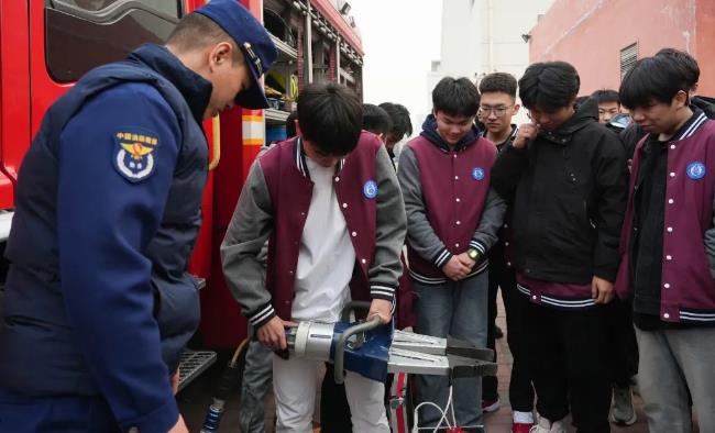 在講解完知識後,消防員帶領同學們參(cān)觀消防車。在消(xiāo)防員的指導下,同學們練(liàn)習(xí)使用消防設備。
